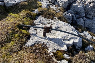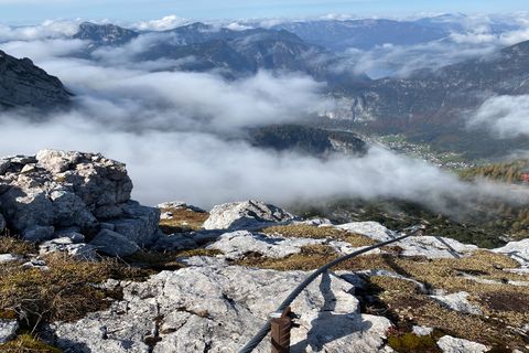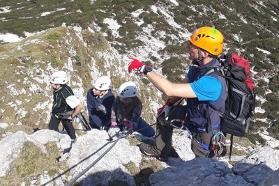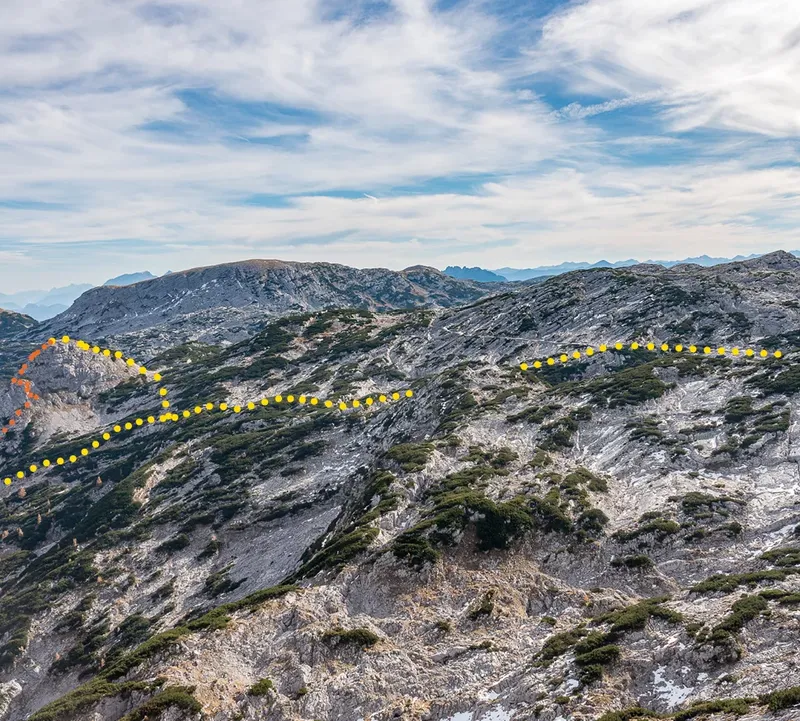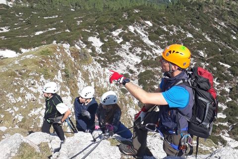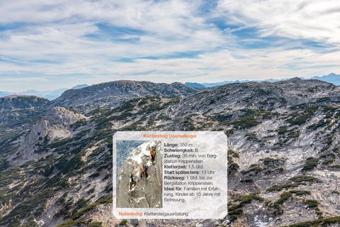 The final rocky section again involves passages rated B to B/C, after which the terrain gradually becomes easier. The via ferrata ends where mountain pines and easier terrain take over. In a few minutes, you will reach a marked hiking trail (A to A/B) in the mountain pine area.