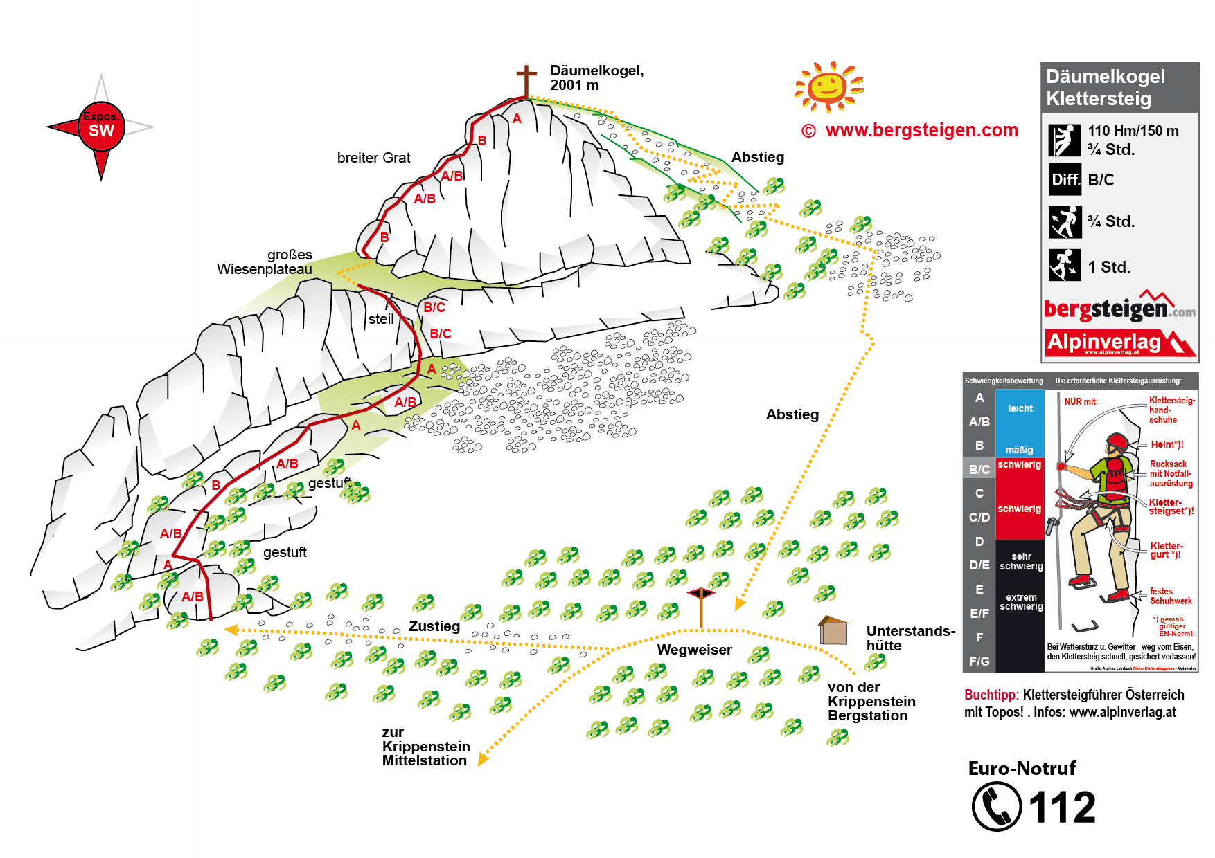 The entrance is relatively moderate (grade A/B), with rock slabs offering good handholds and footholds. The difficulty quickly increases on a steeper slab (B to B/C), which requires sure-footedness and some strength.
